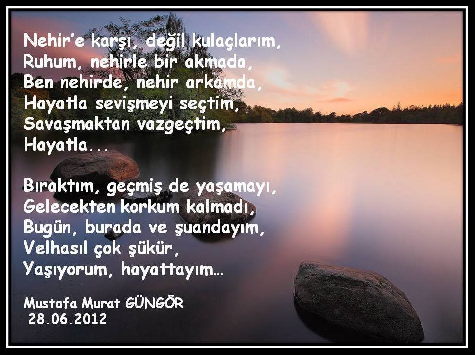 Bilerek hiç kimseyi, Kırmak istemedim Bilmeyerek kırdığım, Her kesten, tüm kalbimle, Af dilerim, Bilerek yada bilmeyerek, Beni kıranları, çoktan affettim, Unuttum, çektiğim tüm acıları, Yaşadıklarımdan çıkardığım dersleri, Tecrübe tespihime ekledim, Düşünmeden, sever mi, diye beni, Sevilmeyi ummadan sevdim, Sevgi hiç direnmedi, karşılığını verdi, Her daim, sevdim, sevildim, Hiç bir şey beklemeden verdim, Geri gelir mi, diye düşünmeden, Hep geri geldi misliyle, Canı gönülden, ne varsa verdiğim, Hayatı, zorlamayı bıraktım, Hayat, zorlaşmayı bıraktı, Gelene, direnmekten vazgeçtim, Direnecek bir şey kalmadı, Gelen her neyse, Hoş geldin dedim, Kim bilir, ne hoşluklar, Getirdin, Gelen her şeyi , Olduğu gibi, Kabullendim, Buyur ettim içeri, Başı, belki biraz Acı olsa dahi, Sonu, daima Mutlu etti beni, Nehir’e karşı, değil kulaçlarım, Ruhum, nehirle bir akmada, Ben nehirde, nehir arkamda, Hayatla sevişmeyi seçtim, Savaşmaktan vazgeçtim, Hayatla… Bıraktım, geçmiş de yaşamayı, Gelecekten korkum kalmadı, Bugün, burada ve şuandayım, Velhasıl çok şükür, Yaşıyorum, hayattayım… Mustafa Murat GÜNGÖR 28.06.2012 (c) Bu şiirin her türlü telif hakkı şairin kendisine ve/veya temsilcilerine aittir.Şiirlerin izin alınmadan kopyalanması ve kullanılması 5846 sayılı Fikir ve Sanat Eserleri Yasasına göre suçtur.