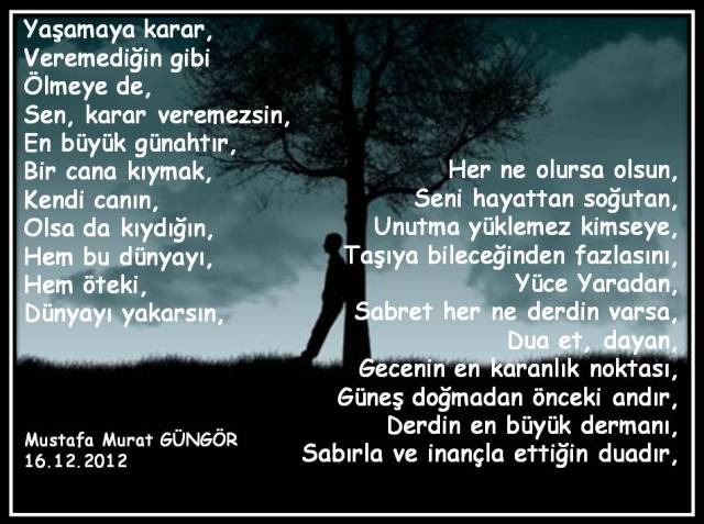 Bir biri ardına, devrilen her yıl, insandan, bir şeyler alıp, götürürken, birçok şeyleri de getirip, koyar ömür heybesine. Kaybettiklerimiz uğruna, kazandığımız ve ileriki yaşantımızda, bize fayda sağlayacak her şey TECRÜBEDİR. Her dert, her sıkıntı, her üzüntü, her kayıp, hayatın bize bir şeyler katma, bir şeyler anlatma çabasıdır. Bu çabaya kızarak, kırılarak, küserek, kendi kabuğumuza çekilerek değil, sebebini sorgulayarak, eksikliklerimizi gidererek, fazlalıklarımızı törpüleyerek ve bir daha aynı duruma düşmemek için, evvelce attığımız yanlış adımları, tekrarlamaktan vazgeçerek, hayata verdiğimiz her cevap TECRÜBEDİR… TECRÜBE acıdır ve aynı zamanda paha biçilmezdir zira onu kazanabilmek adına, bir şeyi kaybetmek, bir şeyden vazgeçmek, bir derde katlanmak, bir sıkıntıyı aşmak, kısacası büyük bir bedel ödemek zorundayızdır. Ve zamanla tecrübelerimiz arttıkça, hayatı ve karşımıza çıkarttığı, insanları, olayları ve durumları, daha iyi anlayıp, perde arkasındakileri daha iyi görmeye başlarız… Yeter ki hayatın bizi olgunlaştırmak, kendimize getirmek, dünyaya geliş amacımızı bize hatırlatmak için karşımıza çıkardıklarına, İyi, kötü, hoş, nahoş, demeden, hoş geldin deyip, buyur edebilelim başköşeye ve yaşamış olduğumuz her şeye sevgiyle şükredebilelim… Bu günüme gelmemde, bu günkü ben olmamda, hayatımda kazandığım ve boncuk, boncuk, TECRÜBE tespihime eklediğim, her bir tecrübede, emeği geçen tüm güzel canlara, sevgili aileme, akrabalarıma, dostlarıma, arkadaşlarıma, hayatımın her hangi bir diliminde, yolumuzun kesiştiği güzel yürekli, güzel insanlara, çok teşekkür ediyorum. Hayatıma kattıklarınız için teşekkürler, Bana yaşattıklarınız için teşekkürler, iyi ki varsınız, iyi ki sizleri tanıdım, sağ olun, var olun… Her dem sevgi, dostluk ve muhabbetle… Mustafa Murat Güngör 23.05.2014 (c) Bu yazının her türlü telif hakkı yazarın kendisine ve/veya temsilcilerine aittir. Yazıların izin alınmadan kopyalanması ve kullanılması 5846 sayılı Fikir ve Sanat Eserleri Yasasına göre suçtur.