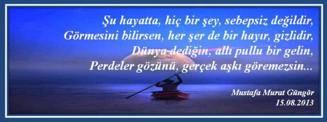 Bir biri ardına, devrilen her yıl, insandan, bir şeyler alıp, götürürken, birçok şeyleri de getirip, koyar ömür heybesine. Kaybettiklerimiz uğruna, kazandığımız ve ileriki yaşantımızda, bize fayda sağlayacak her şey TECRÜBEDİR. Her dert, her sıkıntı, her üzüntü, her kayıp, hayatın bize bir şeyler katma, bir şeyler anlatma çabasıdır. Bu çabaya kızarak, kırılarak, küserek, kendi kabuğumuza çekilerek değil, sebebini sorgulayarak, eksikliklerimizi gidererek, fazlalıklarımızı törpüleyerek ve bir daha aynı duruma düşmemek için, evvelce attığımız yanlış adımları, tekrarlamaktan vazgeçerek, hayata verdiğimiz her cevap TECRÜBEDİR… TECRÜBE acıdır ve aynı zamanda paha biçilmezdir zira onu kazanabilmek adına, bir şeyi kaybetmek, bir şeyden vazgeçmek, bir derde katlanmak, bir sıkıntıyı aşmak, kısacası büyük bir bedel ödemek zorundayızdır. Ve zamanla tecrübelerimiz arttıkça, hayatı ve karşımıza çıkarttığı, insanları, olayları ve durumları, daha iyi anlayıp, perde arkasındakileri daha iyi görmeye başlarız… Yeter ki hayatın bizi olgunlaştırmak, kendimize getirmek, dünyaya geliş amacımızı bize hatırlatmak için karşımıza çıkardıklarına, İyi, kötü, hoş, nahoş, demeden, hoş geldin deyip, buyur edebilelim başköşeye ve yaşamış olduğumuz her şeye sevgiyle şükredebilelim… Bu günüme gelmemde, bu günkü ben olmamda, hayatımda kazandığım ve boncuk, boncuk, TECRÜBE tespihime eklediğim, her bir tecrübede, emeği geçen tüm güzel canlara, sevgili aileme, akrabalarıma, dostlarıma, arkadaşlarıma, hayatımın her hangi bir diliminde, yolumuzun kesiştiği güzel yürekli, güzel insanlara, çok teşekkür ediyorum. Hayatıma kattıklarınız için teşekkürler, Bana yaşattıklarınız için teşekkürler, iyi ki varsınız, iyi ki sizleri tanıdım, sağ olun, var olun… Her dem sevgi, dostluk ve muhabbetle… Mustafa Murat Güngör 23.05.2014 (c) Bu yazının her türlü telif hakkı yazarın kendisine ve/veya temsilcilerine aittir. Yazıların izin alınmadan kopyalanması ve kullanılması 5846 sayılı Fikir ve Sanat Eserleri Yasasına göre suçtur.