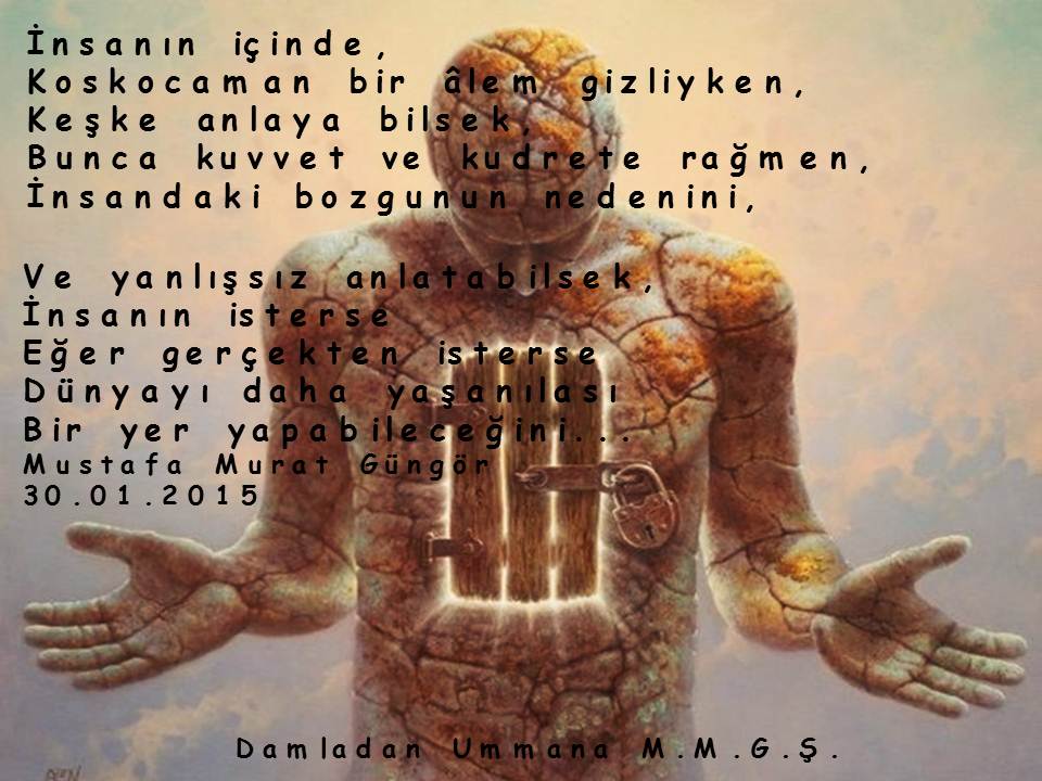 Bir biri ardına, devrilen her yıl, insandan, bir şeyler alıp, götürürken, birçok şeyleri de getirip, koyar ömür heybesine. Kaybettiklerimiz uğruna, kazandığımız ve ileriki yaşantımızda, bize fayda sağlayacak her şey TECRÜBEDİR. Her dert, her sıkıntı, her üzüntü, her kayıp, hayatın bize bir şeyler katma, bir şeyler anlatma çabasıdır. Bu çabaya kızarak, kırılarak, küserek, kendi kabuğumuza çekilerek değil, sebebini sorgulayarak, eksikliklerimizi gidererek, fazlalıklarımızı törpüleyerek ve bir daha aynı duruma düşmemek için, evvelce attığımız yanlış adımları, tekrarlamaktan vazgeçerek, hayata verdiğimiz her cevap TECRÜBEDİR… TECRÜBE acıdır ve aynı zamanda paha biçilmezdir zira onu kazanabilmek adına, bir şeyi kaybetmek, bir şeyden vazgeçmek, bir derde katlanmak, bir sıkıntıyı aşmak, kısacası büyük bir bedel ödemek zorundayızdır. Ve zamanla tecrübelerimiz arttıkça, hayatı ve karşımıza çıkarttığı, insanları, olayları ve durumları, daha iyi anlayıp, perde arkasındakileri daha iyi görmeye başlarız… Yeter ki hayatın bizi olgunlaştırmak, kendimize getirmek, dünyaya geliş amacımızı bize hatırlatmak için karşımıza çıkardıklarına, İyi, kötü, hoş, nahoş, demeden, hoş geldin deyip, buyur edebilelim başköşeye ve yaşamış olduğumuz her şeye sevgiyle şükredebilelim… Bu günüme gelmemde, bu günkü ben olmamda, hayatımda kazandığım ve boncuk, boncuk, TECRÜBE tespihime eklediğim, her bir tecrübede, emeği geçen tüm güzel canlara, sevgili aileme, akrabalarıma, dostlarıma, arkadaşlarıma, hayatımın her hangi bir diliminde, yolumuzun kesiştiği güzel yürekli, güzel insanlara, çok teşekkür ediyorum. Hayatıma kattıklarınız için teşekkürler, Bana yaşattıklarınız için teşekkürler, iyi ki varsınız, iyi ki sizleri tanıdım, sağ olun, var olun… Her dem sevgi, dostluk ve muhabbetle… Mustafa Murat Güngör 23.05.2014 (c) Bu yazının her türlü telif hakkı yazarın kendisine ve/veya temsilcilerine aittir. Yazıların izin alınmadan kopyalanması ve kullanılması 5846 sayılı Fikir ve Sanat Eserleri Yasasına göre suçtur.