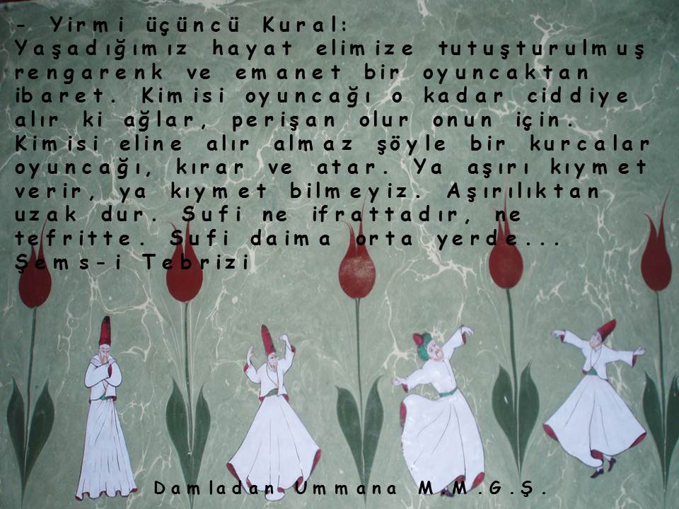 Yaşadığımız hayat elimize tutuşturulmuş rengarenk ve emanet bir oyuncaktan ibaret. Kimisi oyuncağı o kadar ciddiye alır ki ağlar, perişan olur onun için. Kimisi eline alır almaz şöyle bir kurcalar oyuncağı, kırar ve atar. Ya aşırı kıymet verir, ya kıymet bilmeyiz. Aşırılıktan uzak dur. Sufi ne ifrattadır, ne tefritte. Sufi daima orta yerde…