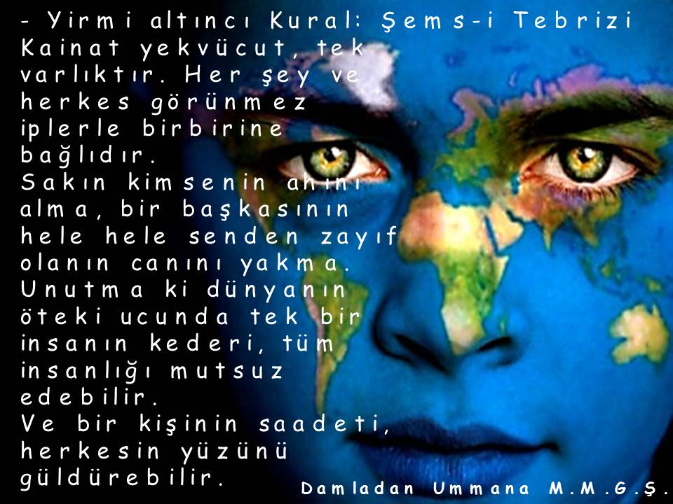 Kainat yekvücut, tek varlıktır. Her şey ve herkes görünmez iplerle birbirine bağlıdır. Sakın kimsenin ahını alma, bir başkasının hele hele senden zayıf olanın canını yakma.Unutma ki dünyanın öteki ucunda tek bir insanın kederi, tüm insanlığı mutsuz edebilir.