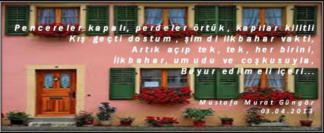 Bir biri ardına, devrilen her yıl, insandan, bir şeyler alıp, götürürken, birçok şeyleri de getirip, koyar ömür heybesine. Kaybettiklerimiz uğruna, kazandığımız ve ileriki yaşantımızda, bize fayda sağlayacak her şey TECRÜBEDİR. Her dert, her sıkıntı, her üzüntü, her kayıp, hayatın bize bir şeyler katma, bir şeyler anlatma çabasıdır. Bu çabaya kızarak, kırılarak, küserek, kendi kabuğumuza çekilerek değil, sebebini sorgulayarak, eksikliklerimizi gidererek, fazlalıklarımızı törpüleyerek ve bir daha aynı duruma düşmemek için, evvelce attığımız yanlış adımları, tekrarlamaktan vazgeçerek, hayata verdiğimiz her cevap TECRÜBEDİR… TECRÜBE acıdır ve aynı zamanda paha biçilmezdir zira onu kazanabilmek adına, bir şeyi kaybetmek, bir şeyden vazgeçmek, bir derde katlanmak, bir sıkıntıyı aşmak, kısacası büyük bir bedel ödemek zorundayızdır. Ve zamanla tecrübelerimiz arttıkça, hayatı ve karşımıza çıkarttığı, insanları, olayları ve durumları, daha iyi anlayıp, perde arkasındakileri daha iyi görmeye başlarız… Yeter ki hayatın bizi olgunlaştırmak, kendimize getirmek, dünyaya geliş amacımızı bize hatırlatmak için karşımıza çıkardıklarına, İyi, kötü, hoş, nahoş, demeden, hoş geldin deyip, buyur edebilelim başköşeye ve yaşamış olduğumuz her şeye sevgiyle şükredebilelim… Bu günüme gelmemde, bu günkü ben olmamda, hayatımda kazandığım ve boncuk, boncuk, TECRÜBE tespihime eklediğim, her bir tecrübede, emeği geçen tüm güzel canlara, sevgili aileme, akrabalarıma, dostlarıma, arkadaşlarıma, hayatımın her hangi bir diliminde, yolumuzun kesiştiği güzel yürekli, güzel insanlara, çok teşekkür ediyorum. Hayatıma kattıklarınız için teşekkürler, Bana yaşattıklarınız için teşekkürler, iyi ki varsınız, iyi ki sizleri tanıdım, sağ olun, var olun… Her dem sevgi, dostluk ve muhabbetle… Mustafa Murat Güngör 23.05.2014 (c) Bu yazının her türlü telif hakkı yazarın kendisine ve/veya temsilcilerine aittir. Yazıların izin alınmadan kopyalanması ve kullanılması 5846 sayılı Fikir ve Sanat Eserleri Yasasına göre suçtur.