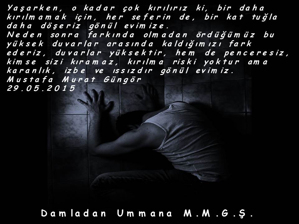 Yaşarken, o kadar çok kırılırız ki, bir daha kırılmamak için, her seferin de, bir kat tuğla daha döşeriz gönül evimize. Neden sonra farkında olmadan ördüğümüz bu yüksek duvarlar arasında kaldığımızı fark ederiz, duvarlar yüksektir, hem de penceresiz, kimse sizi kıramaz, kırılma riski yoktur ama karanlık, izbe ve ıssızdır gönül evimiz.
