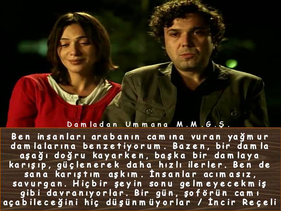 Ben insanları arabanın camına vuran yağmur damlalarına benzetiyorum. Bazen, bir damla aşağı doğru kayarken, başka bir damlaya karışıp, güçlenerek daha hızlı ilerler. Ben de sana karıştım aşkım. İnsanlar acımasız, savurgan. Hiçbir şeyin sonu gelmeyecekmiş gibi davranıyorlar. Bir gün, şoförün camı açabileceğini hiç düşünmüyorlar / İncir Reçeli