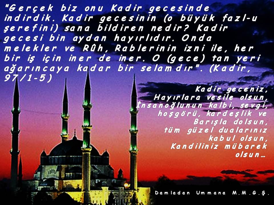 “Gerçek biz onu Kadir gecesinde indirdik. Kadir gecesinin (o büyük fazl-u şerefini) sana bildiren nedir? Kadir gecesi bin aydan hayırlıdır. Onda melekler ve Rûh, Rablerinin izni ile, her bir iş için iner de iner. O (gece) tan yeri ağarıncaya kadar bir selamdır”. (Kadir, 97/1-5)