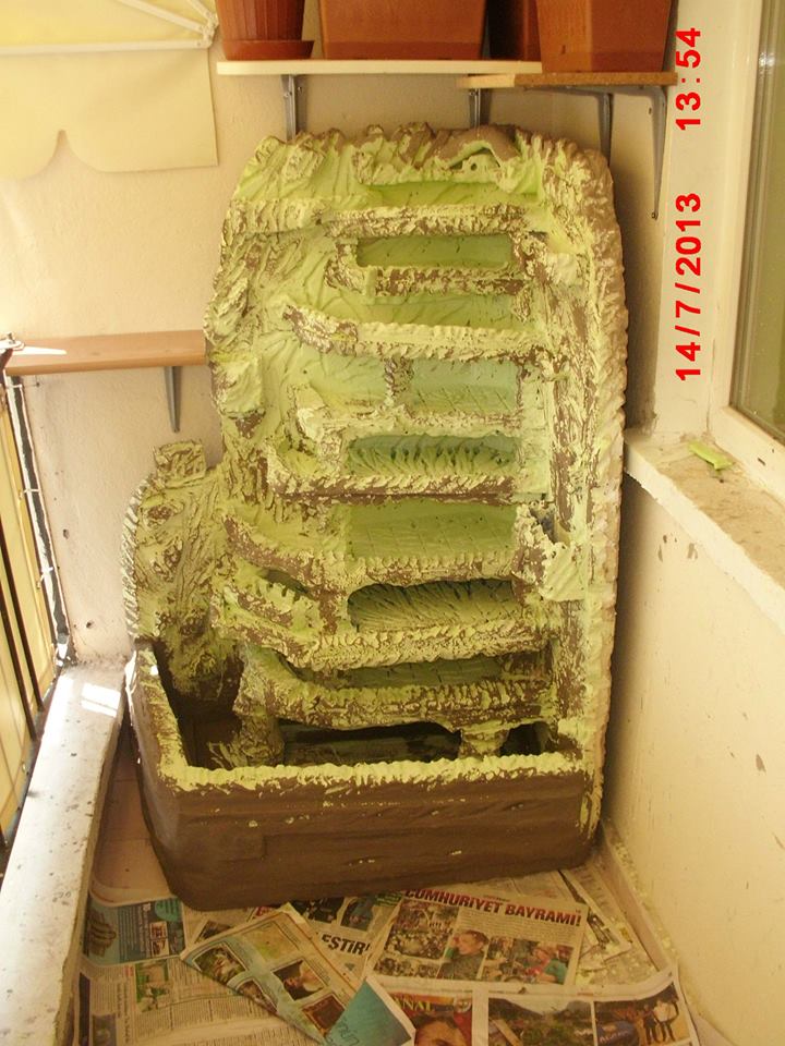 10 – Bolca azim,sabır ve emek zira bu da tıpkı akvaryum yapımında olduğu gibi, kademe, kademe ve bir gün ara verilerek yapılan bir çalışma. Akşamları iş dönüşü yemekten sonra bir, iki saat ayırarak yaklaşık iki ayda tamamladım. 18.05.2015 tarihinde başlamış, 20.07.2015 tarihinde tamamlamışım resimlere baktığımda gördüğüm kadarıyla. (Silikonların yapışması, yada 5-8 kat arası dolgu derzlerinin her bir katının kuruması için en az 24 saat beklemek gerekiyor.)