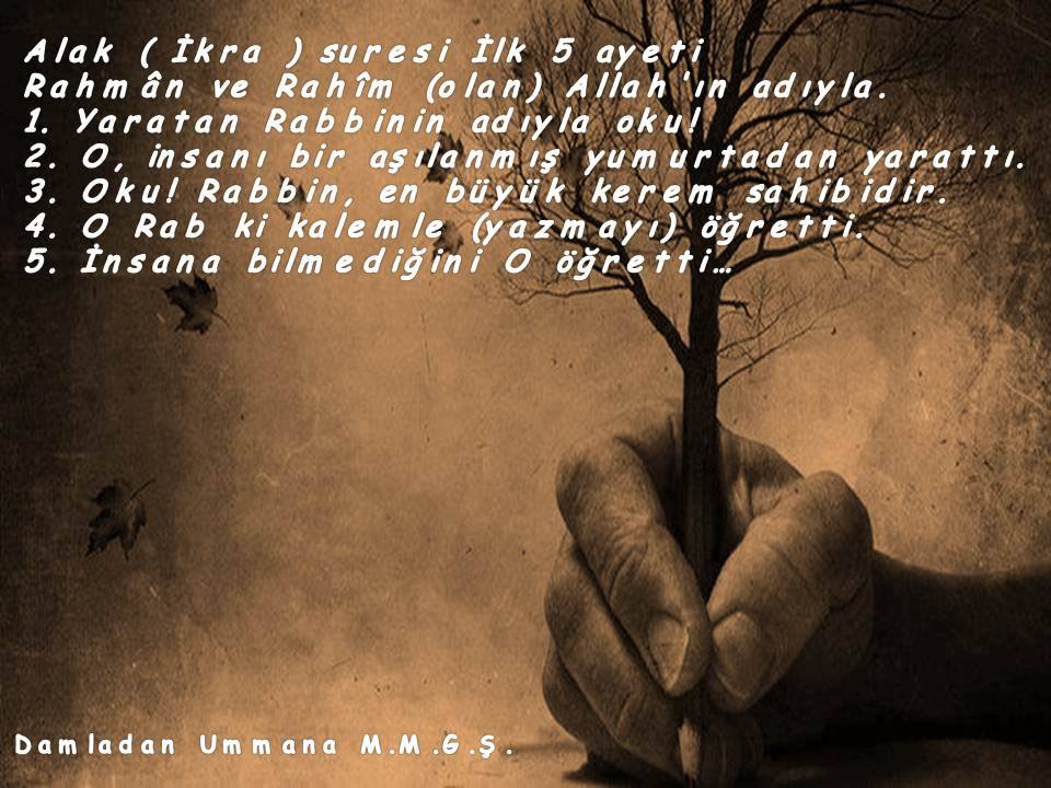 Okumayı, öğrenmeyi, gelişmeyi, olgun ve Kamil insan mertebesine ulaşmayı emreden, yüce, güzel, en son ve Hak dinin mensupları olarak, Kutsal Kitabımız Kur’an-ı Kerim’in ilk ayetinde emredildiği üzere OKU’ malıyız. Sonraki ayetinde kalemle YAZMAYI öğrenenler, okuyup öğrendiklerini diğer insanlara da anlatarak onları da aydınlatmalı ve onları da okuma-yazmaya yönlendirerek Cehaletin sonunu getirmelidir.