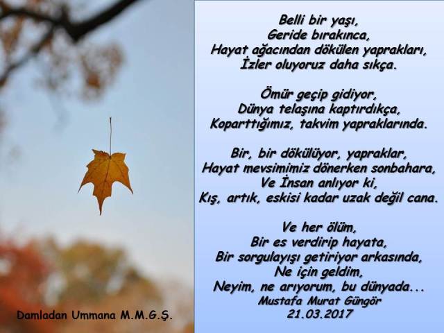 Bir biri ardına, devrilen her yıl, insandan, bir şeyler alıp, götürürken, birçok şeyleri de getirip, koyar ömür heybesine. Kaybettiklerimiz uğruna, kazandığımız ve ileriki yaşantımızda, bize fayda sağlayacak her şey TECRÜBEDİR. Her dert, her sıkıntı, her üzüntü, her kayıp, hayatın bize bir şeyler katma, bir şeyler anlatma çabasıdır. Bu çabaya kızarak, kırılarak, küserek, kendi kabuğumuza çekilerek değil, sebebini sorgulayarak, eksikliklerimizi gidererek, fazlalıklarımızı törpüleyerek ve bir daha aynı duruma düşmemek için, evvelce attığımız yanlış adımları, tekrarlamaktan vazgeçerek, hayata verdiğimiz her cevap TECRÜBEDİR… TECRÜBE acıdır ve aynı zamanda paha biçilmezdir zira onu kazanabilmek adına, bir şeyi kaybetmek, bir şeyden vazgeçmek, bir derde katlanmak, bir sıkıntıyı aşmak, kısacası büyük bir bedel ödemek zorundayızdır. Ve zamanla tecrübelerimiz arttıkça, hayatı ve karşımıza çıkarttığı, insanları, olayları ve durumları, daha iyi anlayıp, perde arkasındakileri daha iyi görmeye başlarız… Yeter ki hayatın bizi olgunlaştırmak, kendimize getirmek, dünyaya geliş amacımızı bize hatırlatmak için karşımıza çıkardıklarına, İyi, kötü, hoş, nahoş, demeden, hoş geldin deyip, buyur edebilelim başköşeye ve yaşamış olduğumuz her şeye sevgiyle şükredebilelim… Bu günüme gelmemde, bu günkü ben olmamda, hayatımda kazandığım ve boncuk, boncuk, TECRÜBE tespihime eklediğim, her bir tecrübede, emeği geçen tüm güzel canlara, sevgili aileme, akrabalarıma, dostlarıma, arkadaşlarıma, hayatımın her hangi bir diliminde, yolumuzun kesiştiği güzel yürekli, güzel insanlara, çok teşekkür ediyorum. Hayatıma kattıklarınız için teşekkürler, Bana yaşattıklarınız için teşekkürler, iyi ki varsınız, iyi ki sizleri tanıdım, sağ olun, var olun… Her dem sevgi, dostluk ve muhabbetle… Mustafa Murat Güngör 23.05.2014 (c) Bu yazının her türlü telif hakkı yazarın kendisine ve/veya temsilcilerine aittir. Yazıların izin alınmadan kopyalanması ve kullanılması 5846 sayılı Fikir ve Sanat Eserleri Yasasına göre suçtur.